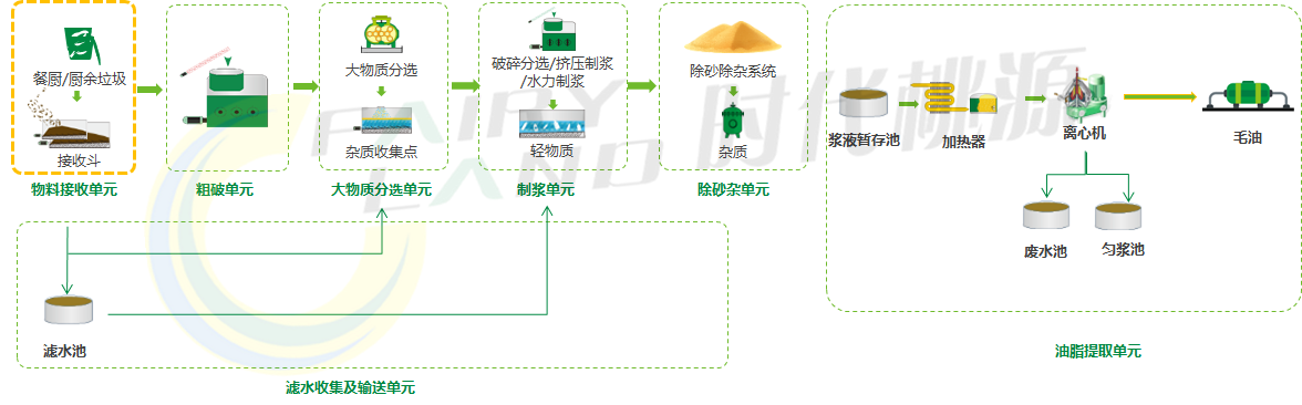 預處理系統(tǒng)主要包括接收、破碎、分選、制漿、除砂雜、提油、物料輸送幾個功能單元。